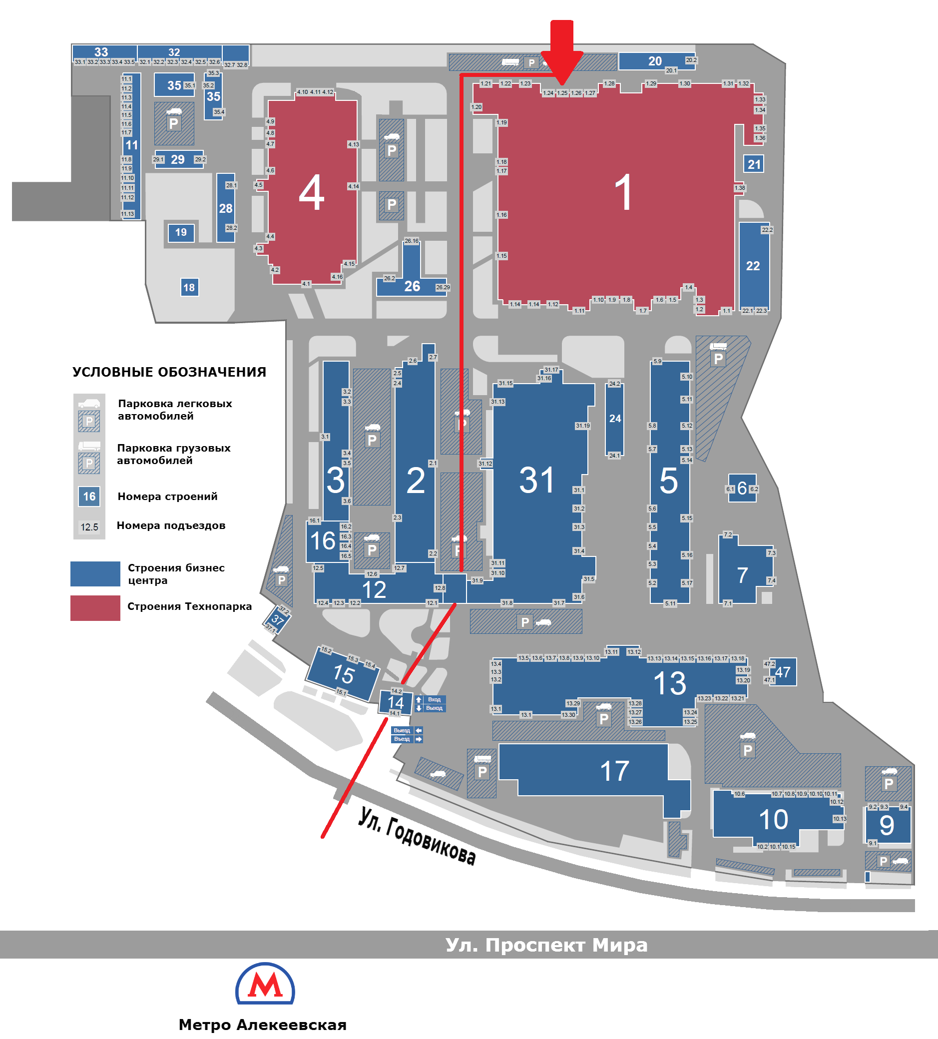 Вход на территорию по пропускам через проходную по адресу ул. Годовикова, д. 9, стр. 14, при себе необходимо иметь паспорт или водительские права.